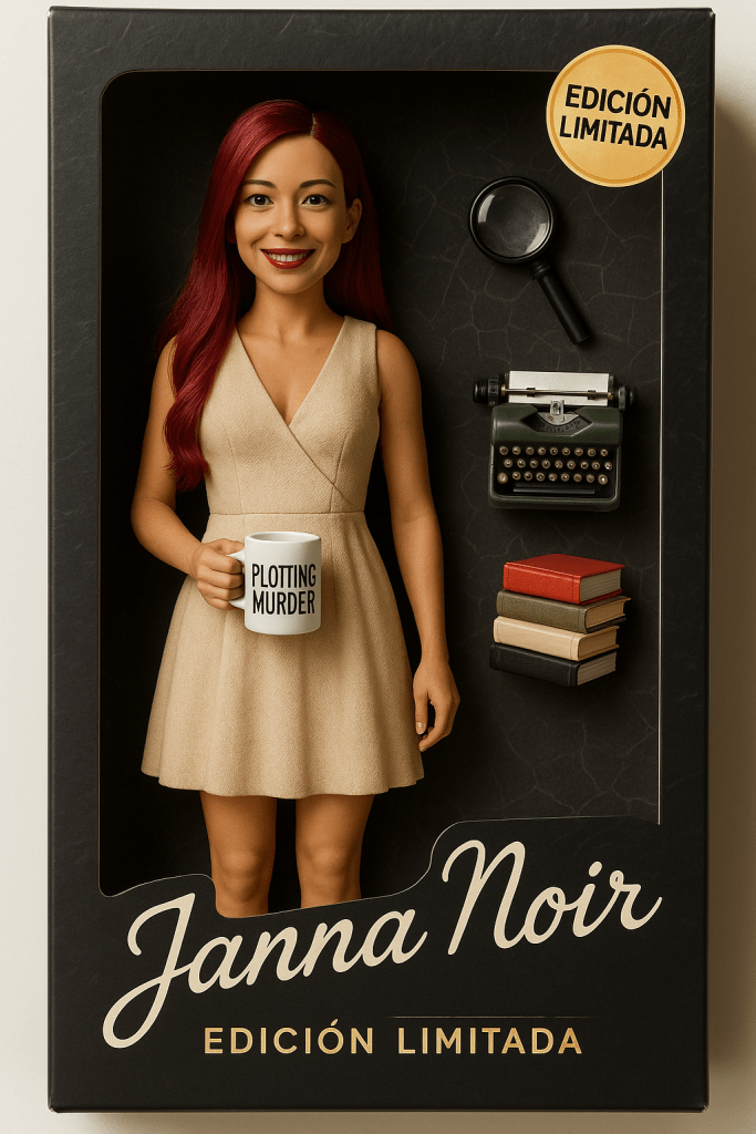 «Crea una figura de una muñeca en un empaque con diseño tipo vitrina, con fondo oscuro, etiquetado en la parte superior con el nombre Janna Noir y en dorado la etiqueta Edición Limitada. Letras en estilo manuscrito. Básate en la imagen adjunta para crear una figura de piel latina, expresión amable en los ojos y labios rojos. Lleva un vestido beige veraniego con escote en V, cabello largo rojo cereza y una sonrisa. En la mano una Taza «Plotting Murder» y los siguientes accesorios: Lupa de investigadora, máquina de escribir vintage y una pila de mini libros. La muñeca esta de pie y de cuerpo entero en la caja.»